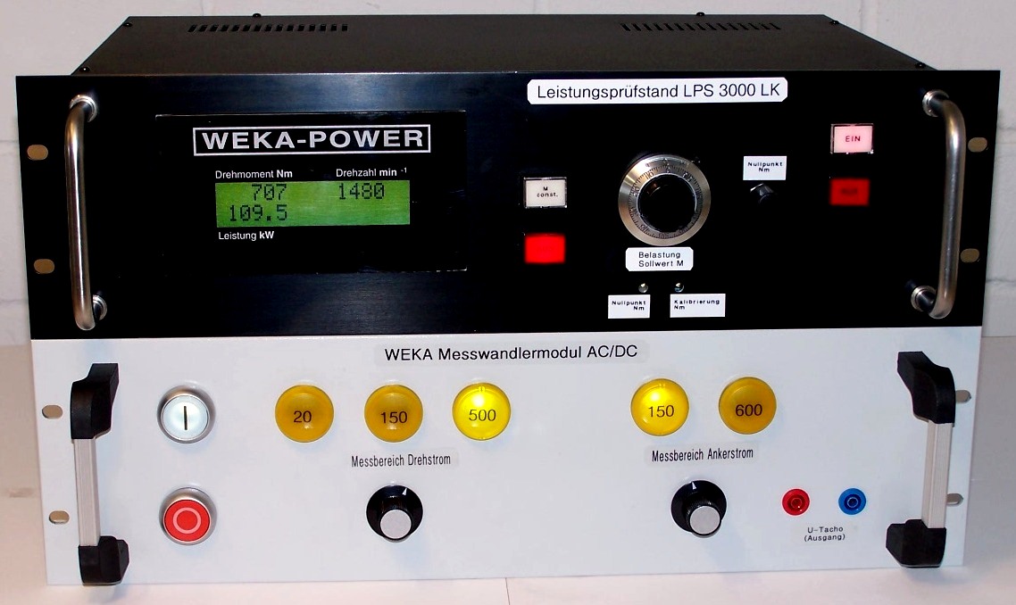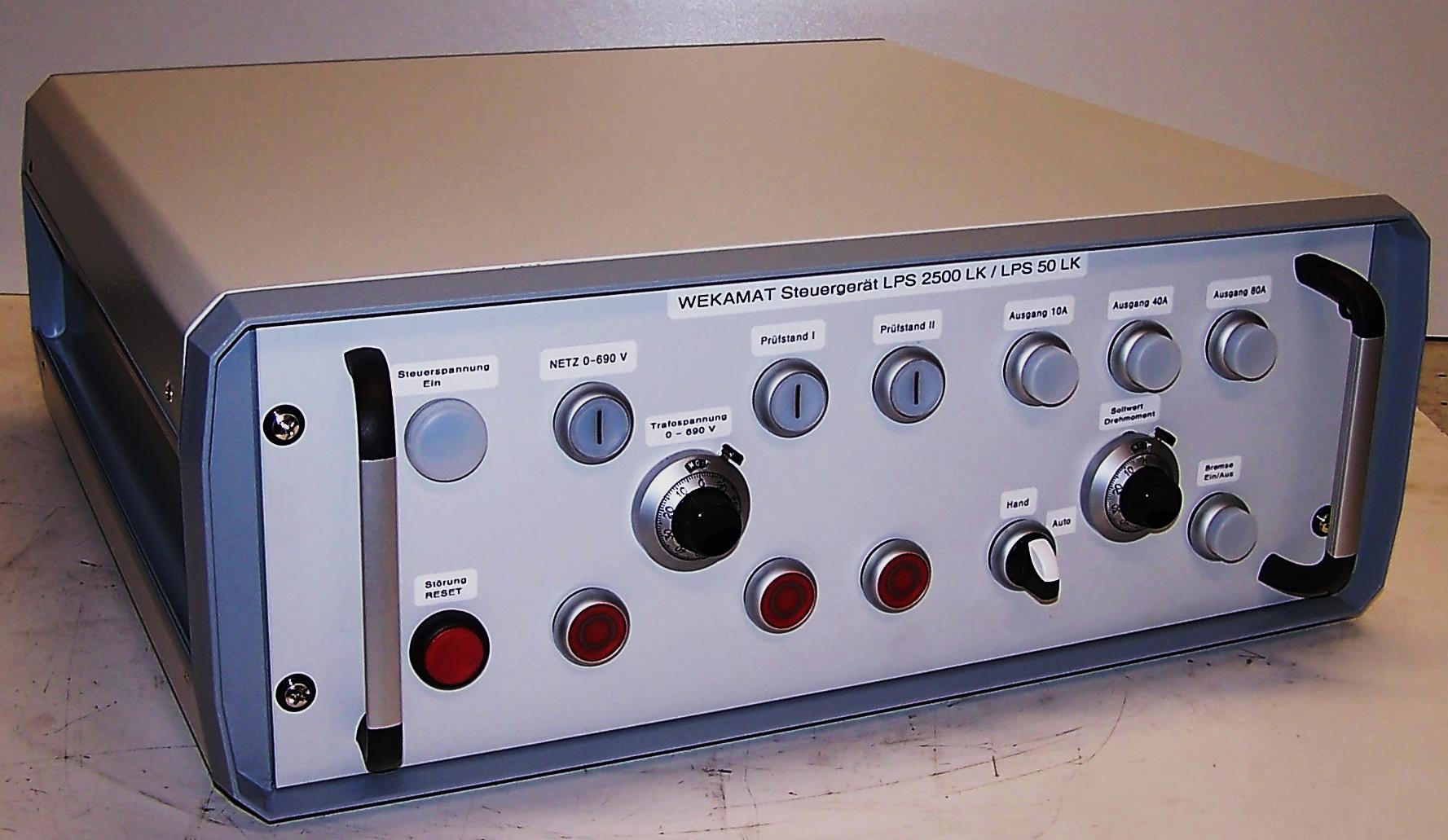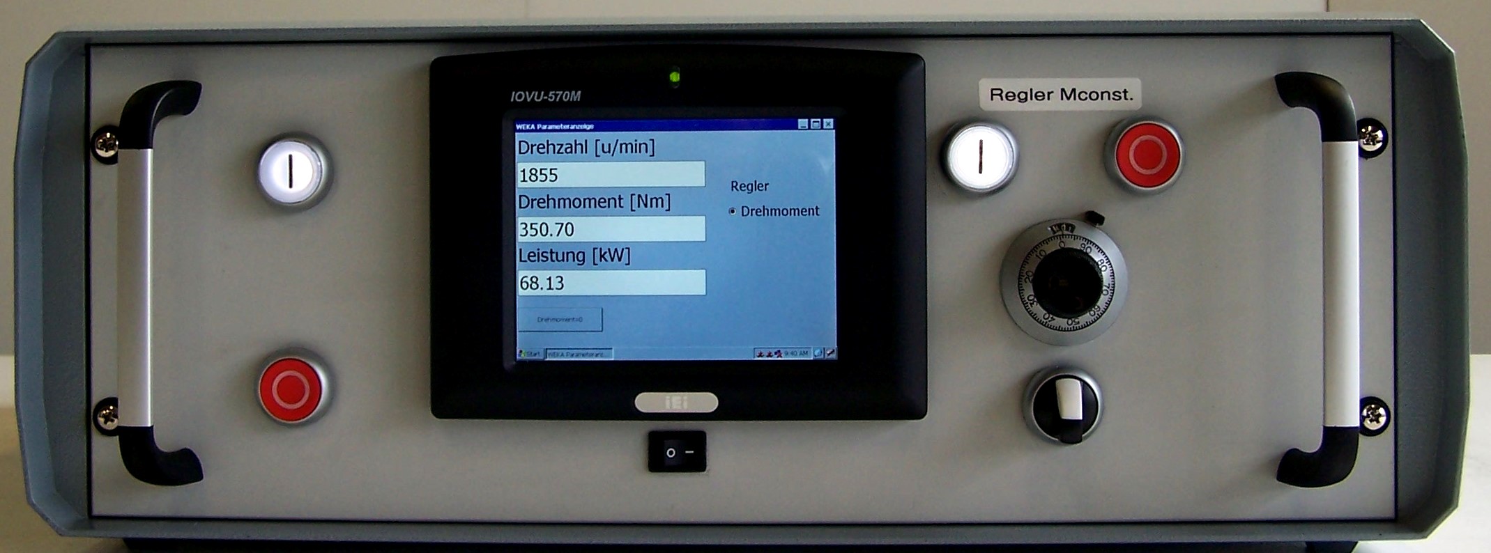 Das bewährte traditionelle WEKA Steuergerät dient zum Ansteuern und Regeln der Wirbelstrombremse sowie der Erfassung und Anzeige der mechanischen Messwerte Drehmoment, Drehzahl und mechanischer Leistung.